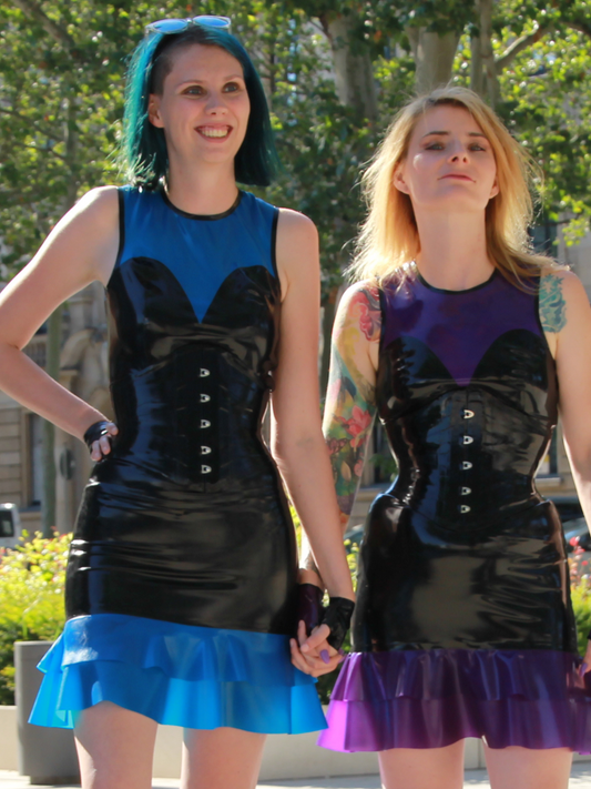 Der obere Rockteil wird auch 0,45mm starkem Latex geklebt, wobei die angesetzten Volants aus 0,33mm Latex gefertigt sind. Das macht sie schön leicht, sodass sie bei jedem Schritt herrlich mitschwingen.