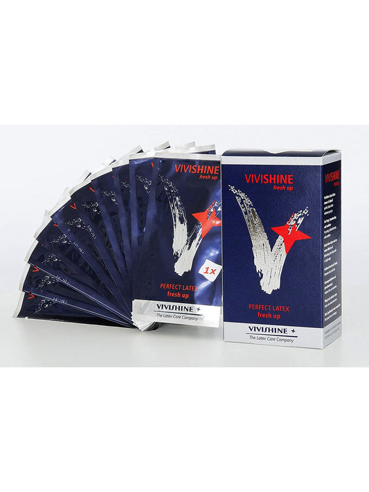 VIVISHINE fresh up ist einzigartig und gibt es nur von uns. Die Idee dazu wurde aus der Praxis heraus geboren. Auf Hochglanz poliertes Latex neigt dazu, beim Sitzen oder unter einem Mantel Fusseln anzuziehen oder etwas matt zu werden. Für Abhilfe sorgt die persönliche und kleinste Polierstation der Welt: VIVISHINE fresh up optimiert den Latex-Glanz mit einem Wisch.